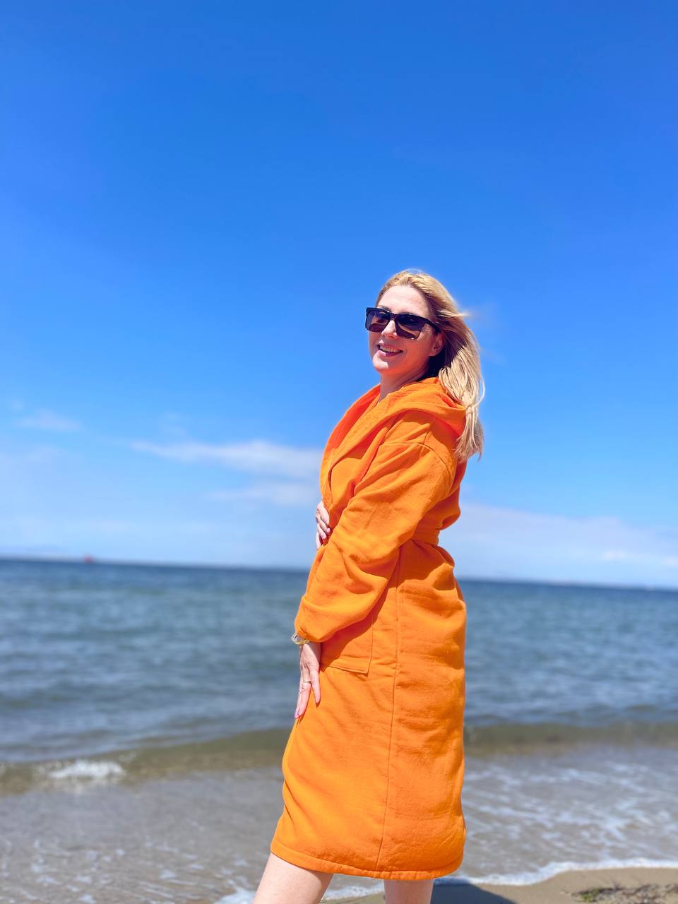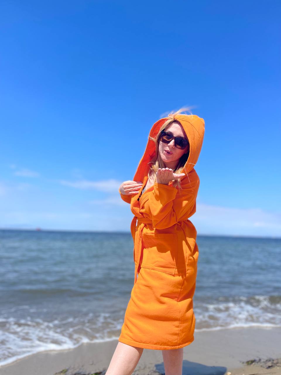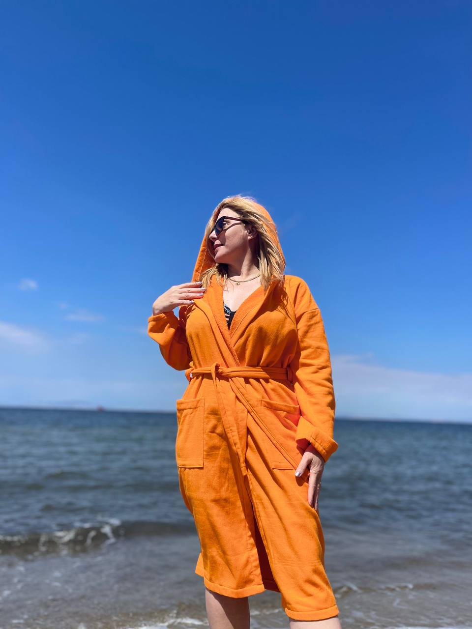 %100 Pamuklu Kapüşonlu Cepli Turuncu Peştemal Bornoz