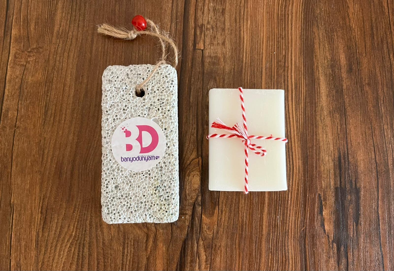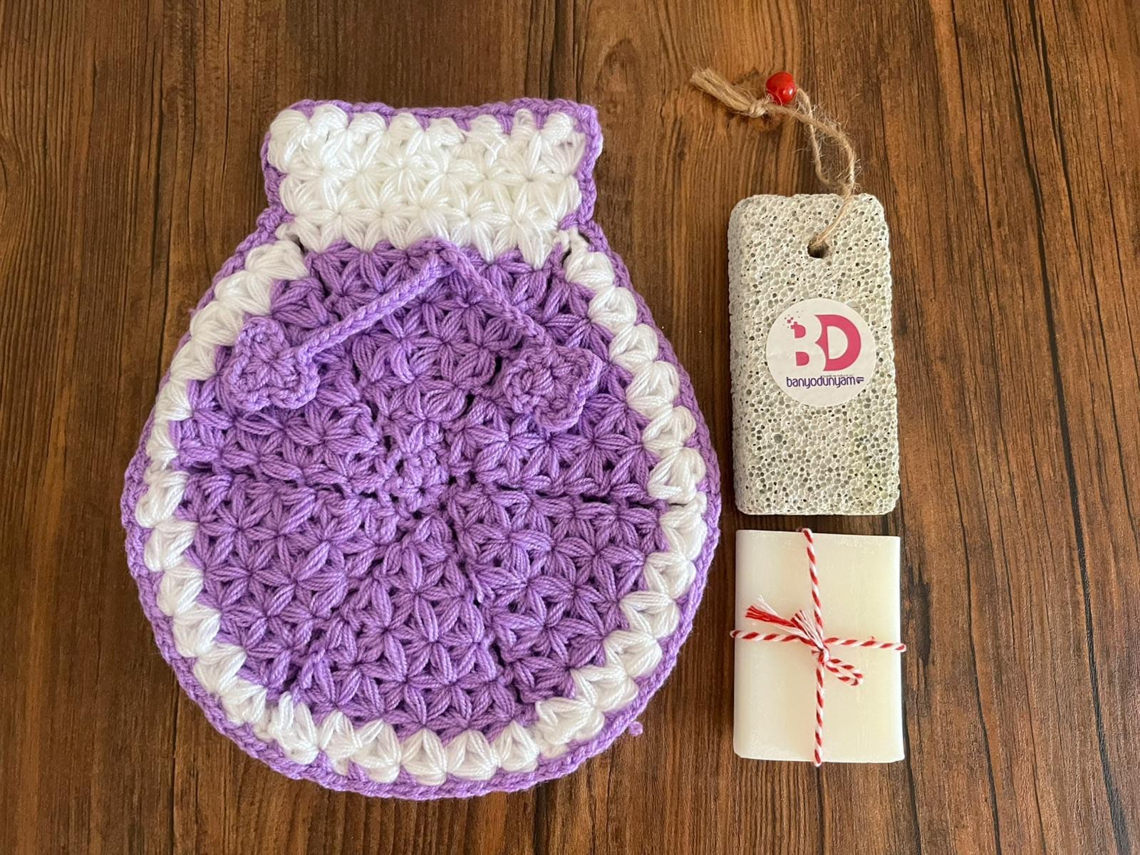 El örgüsü banyo lifi, topuk törpüsü ve beyaz renk hamam kokulu sabundan oluşmaktadır.